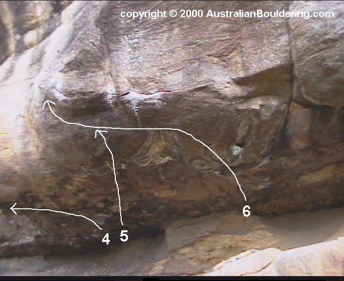 5. Project Start right of Savage then through the shallow pockets to join the top-out of Paul's Present. 6. Paul's Present V10 (FA: